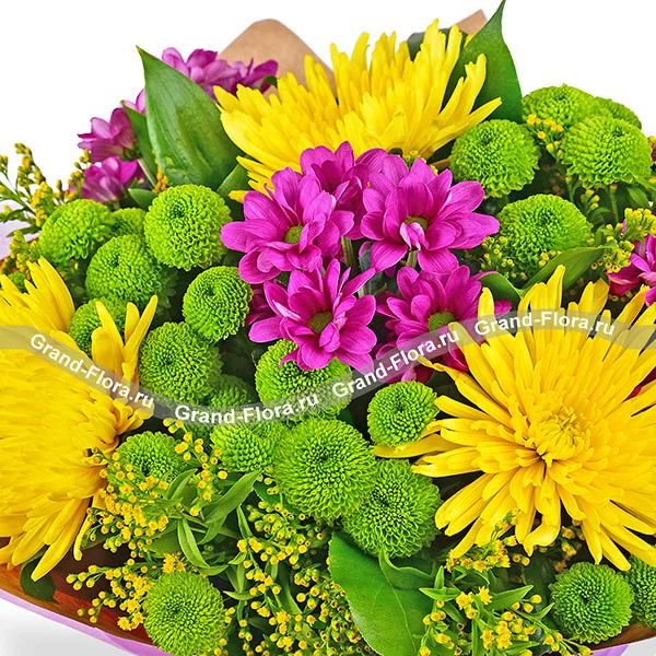 Делюкс: хризантема одноголовая (желтая) - 7 шт., хризантема зеленая кустовая - 7 шт., хризантема фиолетовая кустовая - 7 шт., солидаго - 6 шт., фетр фиолетовый, крафт, лента. Примерный диаметр букета 50х50 см.